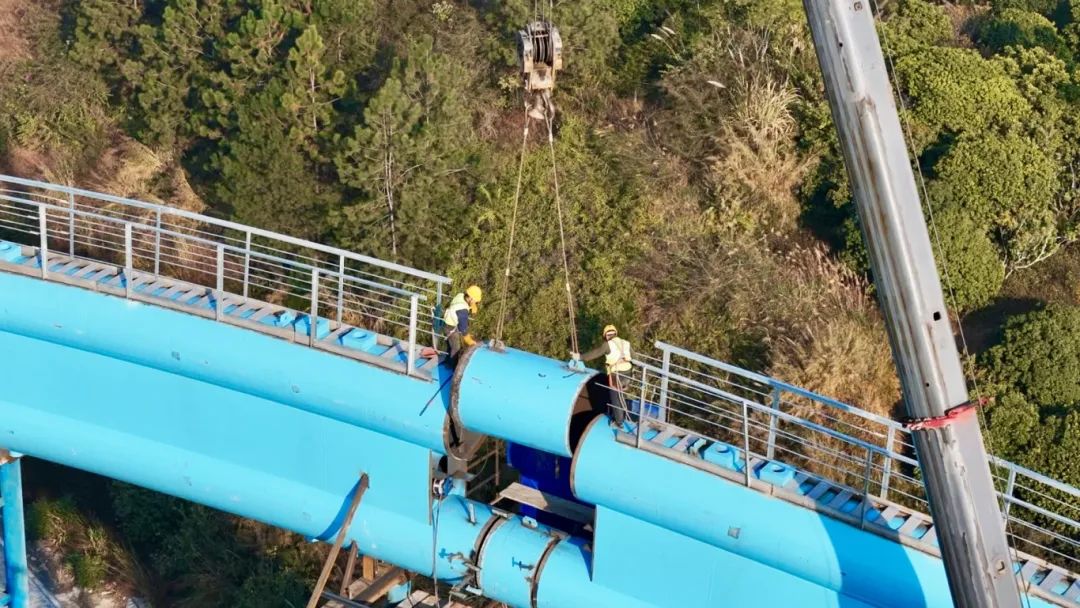 5月26日,国内在建高铁最大跨度系杆拱——南珠高铁玉岑段岑溪跨G65包茂高速特大桥系杆拱主体竣工,具有过梁条件,为后续架梁及无砟道床施工奠定坚实根底。